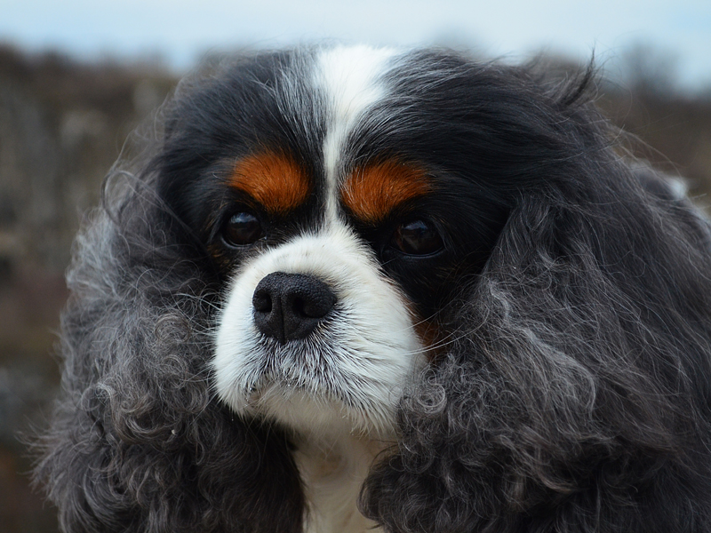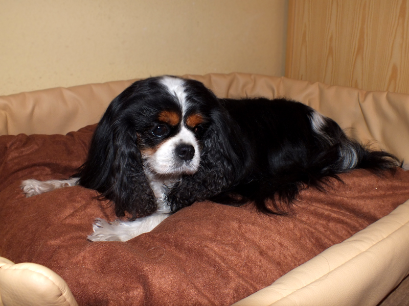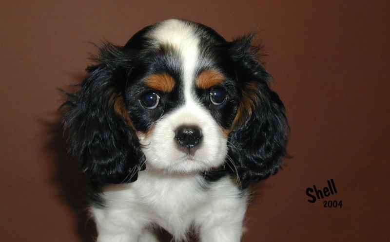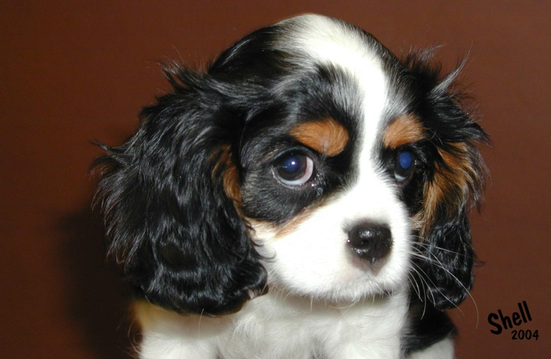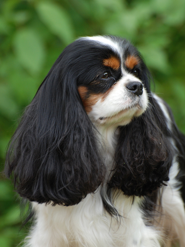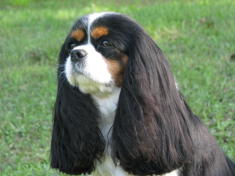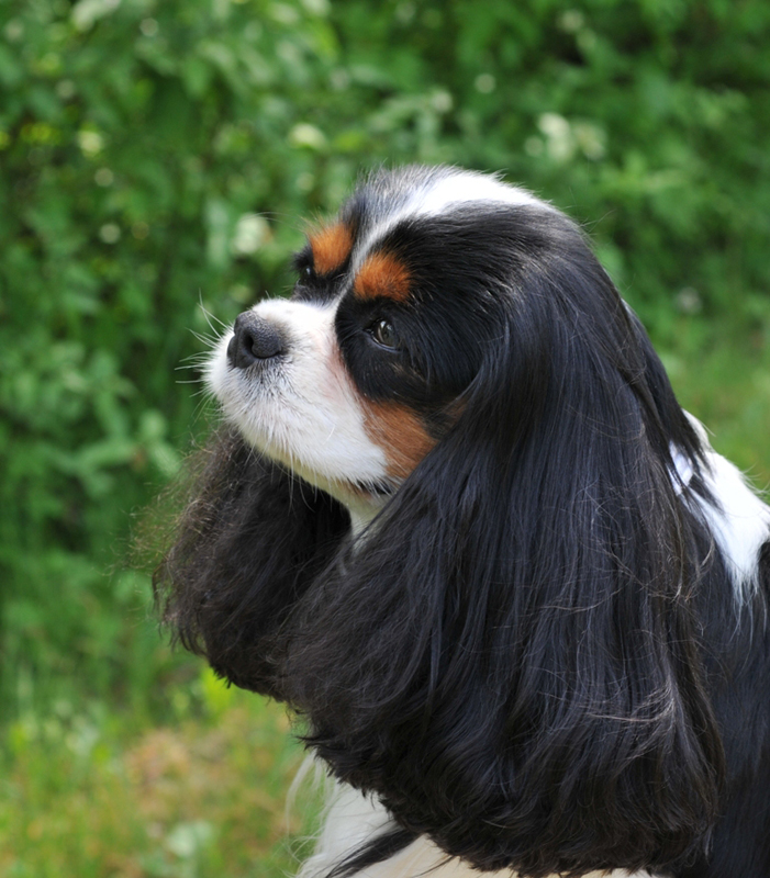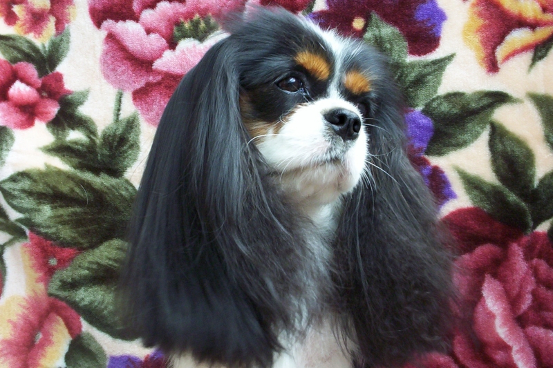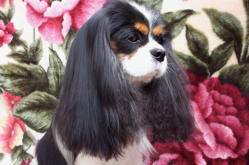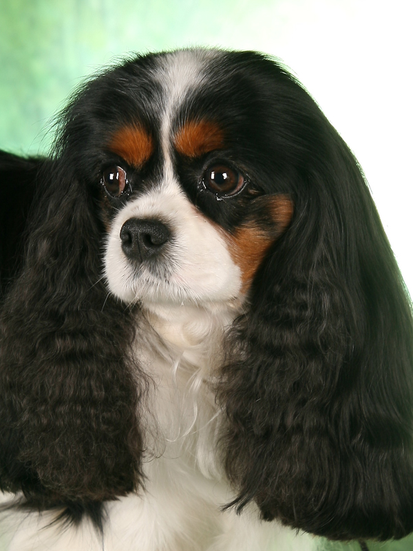 "Glamour headed. Large round dark eyes giving a soft and gentle expression. Good pigment. Long silky ears. Level back. Glamour Cavalier. Exellent." Brian Rix "Ricksbury"
